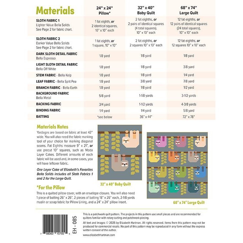 Snuggly Sloths - Printed Quilt Pattern by Elizabeth Hartman is a charming, modern quilting design that brings playful personality to your next project. Perfect for fans of Elizabeth Hartman patterns, this delightful printed quilt pattern helps you create an eye-catching quilt filled with sweet sloths and bold, graphic style.